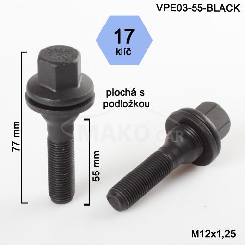Kolový šroub M12x1,25x55mm, plochá podložka, klíč 17, černý