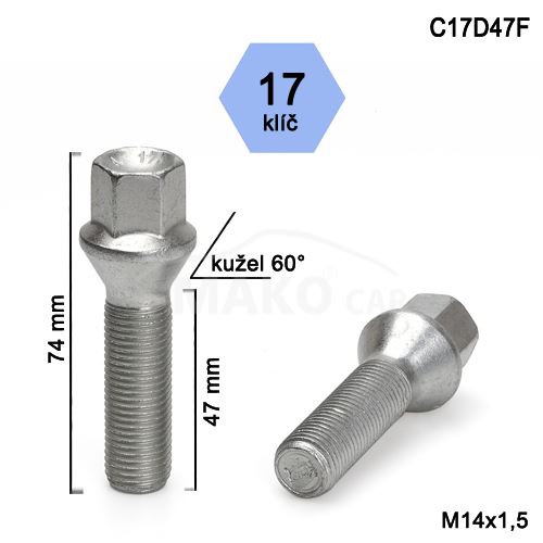 - Kolový šroub M14x1,25x47mm, dosedací plocha kužel, klíč 17, pozink