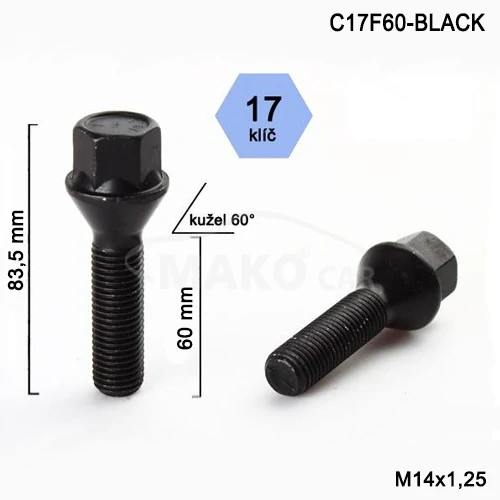 - Kolový šroub M14x1,25x60mm, dosedací plocha kužel, klíč 17, černý