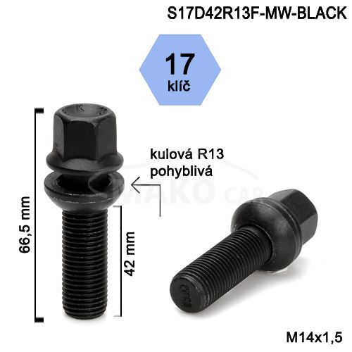 - Kolový šroub M14x1,5x42mm, dosedací plocha koule R13 pohyblivá, klíč 17, barva černá