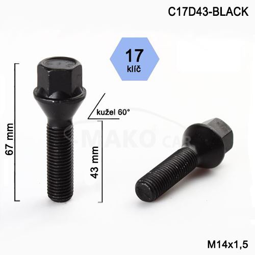 - Kolový šroub M14x1,5x43mm, dosedací plocha kužel, klíč 17, černý