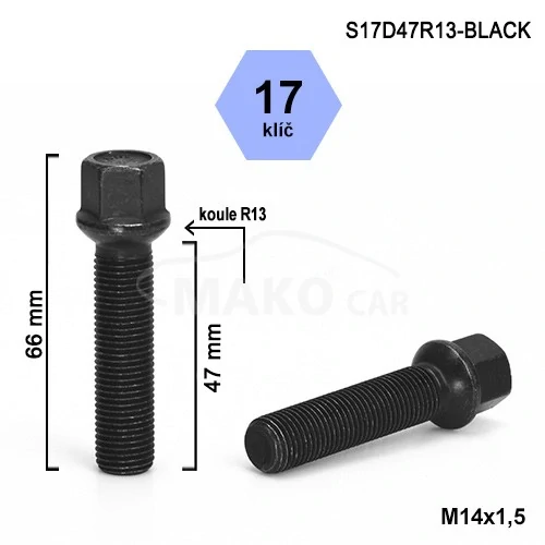 - Kolový šroub M14x1,5x47mm, dosedací plocha koule R13, klíč 17, černý