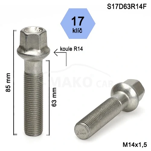 - Kolový šroub M14x1,5x63mm, dosedací plocha koule R14, klíč 17, pozink