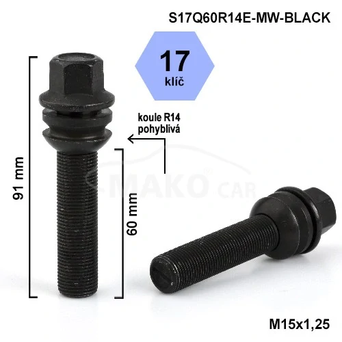 - Kolový šroub M15x1,25x60 koule R14 pohyblivá, klíč 17, černý pozink