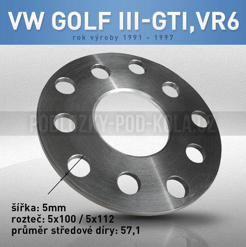 Rozšiřovací podložka VW Golf III GTI, VR6, šíře 5mm, rozteč 5x100, střed 57,1 - průchozí, 1ks