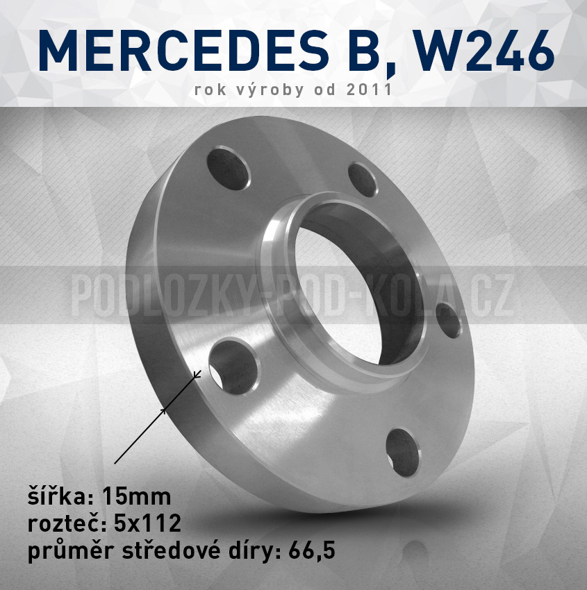 - Rozšiř. podložka Mercedes B W246, šíře 15mm, rozteč 5x112, střed 66,5 - průchozí, 1ks