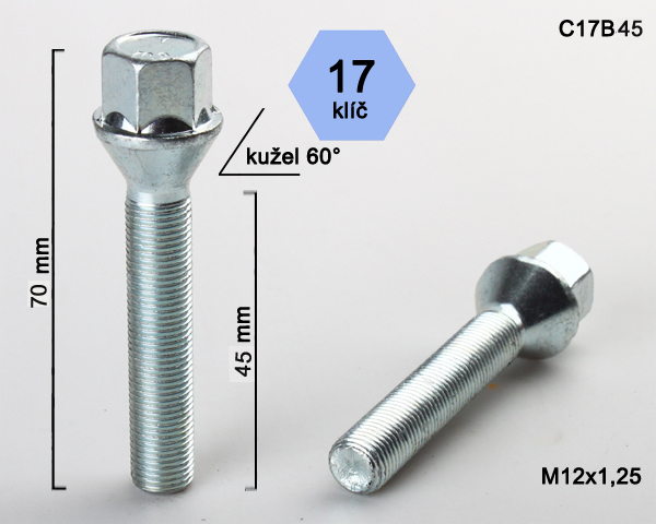 - Kolový šroub M12x1,25x45mm, dosedací plocha kužel, klíč 17, pozink