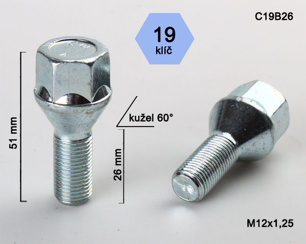 - Kolový šroub M12x1,25x26mm, dosedací plocha kužel, klíč 19, pozink