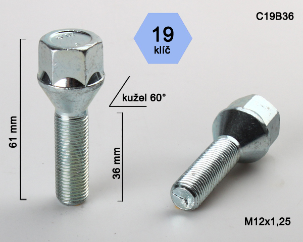 - Kolový šroub M12x1,25x36mm, dosedací plocha kužel, klíč 19, pozink