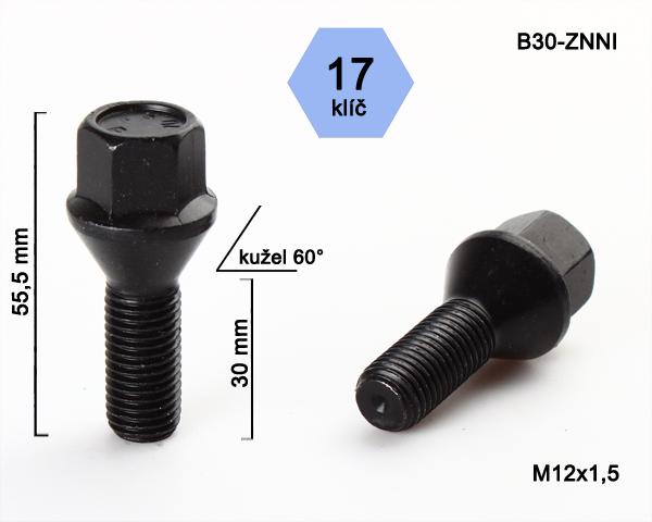 - Kolový šroub M12x1,5x30mm, dosedací plocha kužel, klíč 17, černý pozink