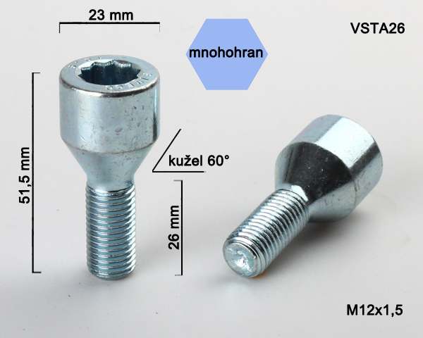 - Kolový šroub M12x1,5x26, kužel s vnitřním mnohohranem, průměr hlavy 23, pozink
