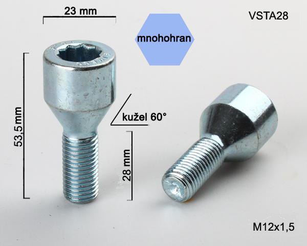 - Kolový šroub M12x1,5x28, kužel s vnitřním mnohohranem, průměr hlavy 23, pozink