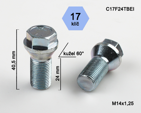 - Kolový šroub M14x1,25x24mm kužel 60° s krátkou hlavou, klíč 17, pozink