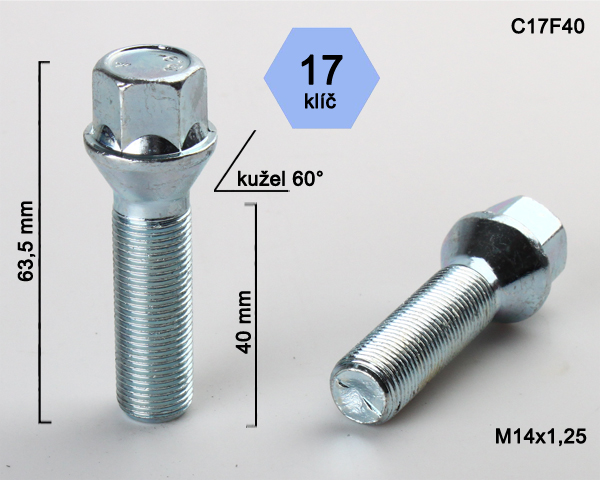 - Kolový šroub M14x1,25x40mm, dosedací plocha kužel, klíč 17, pozink