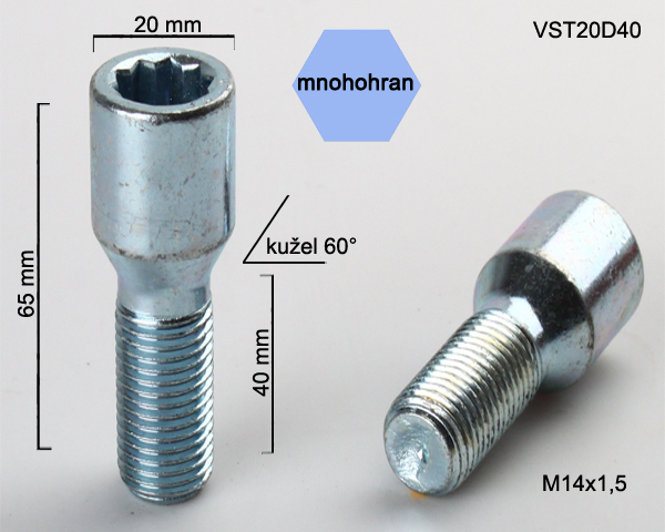 - Kolový šroub M14x1,5x40, kužel s vnitřním mnohohranem, průměr hlavy 20, pozink