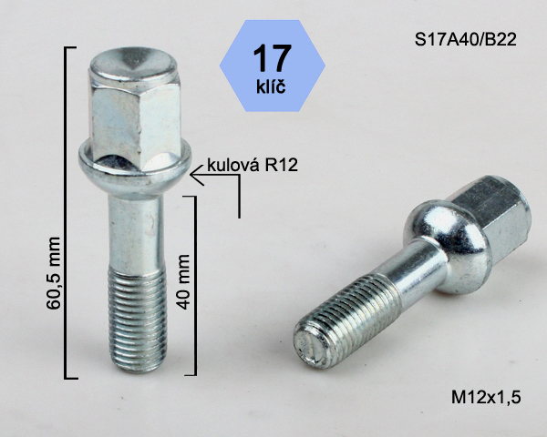 - Kolový šroub M12x1,5x40mm dosedací plocha koule R12, klíč 17, pozink