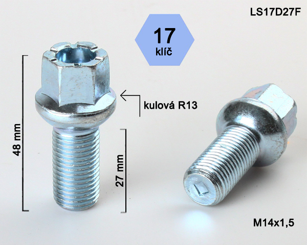 - Kolový šroub M14x1,5x27mm, dosedací plocha koule R13, klíč 17, pozink
