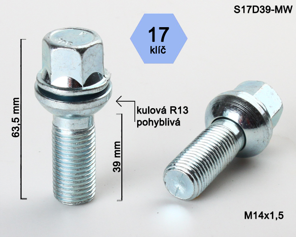 - Kolový šroub M14x1,5x39mm, dosedací plocha koule R13 pohyblivá, klíč 17, pozink