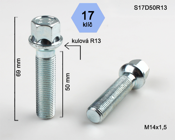 - Kolový šroub M14x1,5x50mm, dosedací plocha koule R13, klíč 17, pozink stříbrný