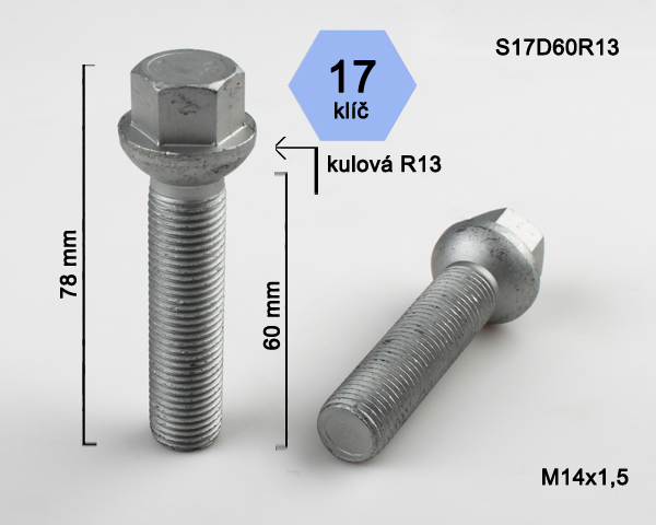 - Kolový šroub M14x1,5x60mm, dosedací plocha koule R13, klíč 17, pozink