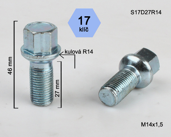 - Kolový šroub M14x1,5x27mm, dosedací plocha koule R14, klíč 17, pozink stříbrný