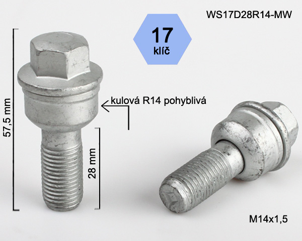 - Kolový šroub M14x1,5x28mm, dosedací plocha koule R14 pohyblivá, klíč 17, pozink