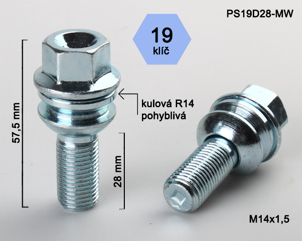 - Kolový šroub M14x1,5x28mm, dosedací plocha koule R14 pohyblivá, klíč 19, pozink stříbrný