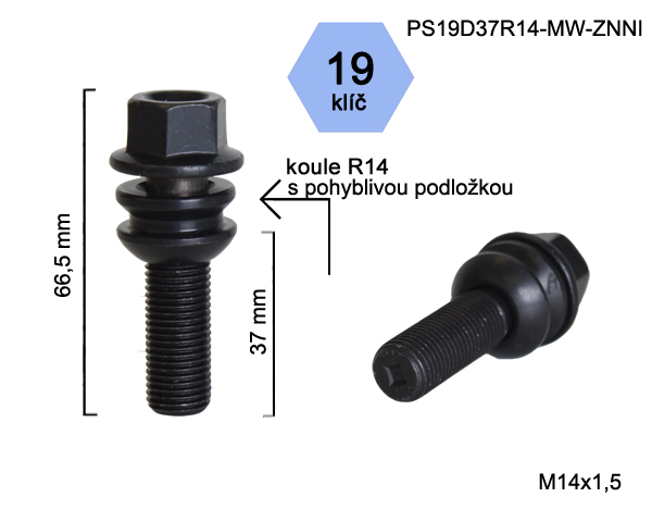 - Kolový šroub M14x1,5x37mm, dosedací plocha koule R14 pohyblivá, klíč 19, pozink černý
