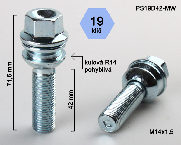- Kolový šroub M14x1,5x42mm, dosedací plocha koule R14 pohyblivá, klíč 19, pozink stříbrný