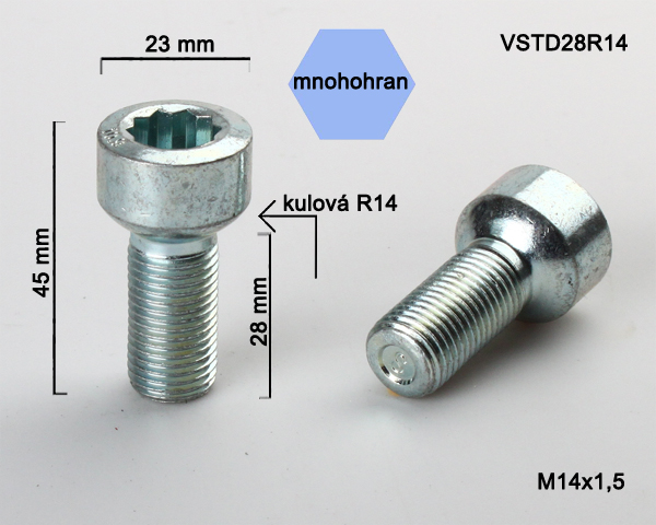 - Kolový šroub M14x1,5x28 koule R14 s vnitřním mnohohranem, průměr hl. 23, pozink