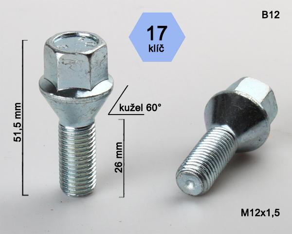 - Kolový šroub M12x1,5x26mm, dosedací plocha kužel, klíč 17, pozink