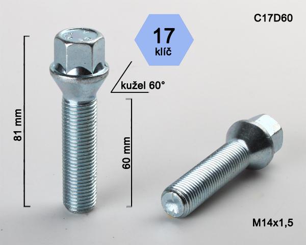 - Kolový šroub M14x1,5x60mm, dosedací plocha kužel, klíč 17, pozink
