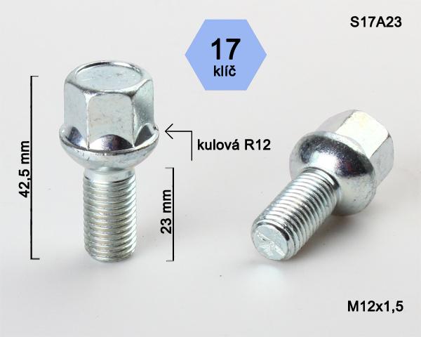 - Kolový šroub M12x1,5x23mm, dosedací plocha koule R12, klíč 17, pozink