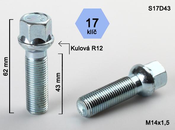- Kolový šroub M14x1,5x43mm, dosedací plocha koule R12, klíč 17, pozink