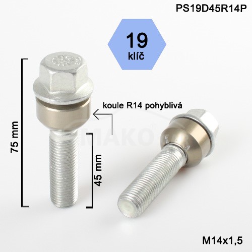 - Kolový šroub M14x1,5x45 kulová R14 pohyblivá, klíč 19, výška 75mm