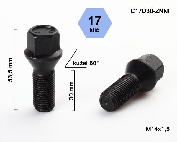 - Kolový šroub M14x1,5x30mm, dosedací plocha kužel, klíč 17, černý pozink