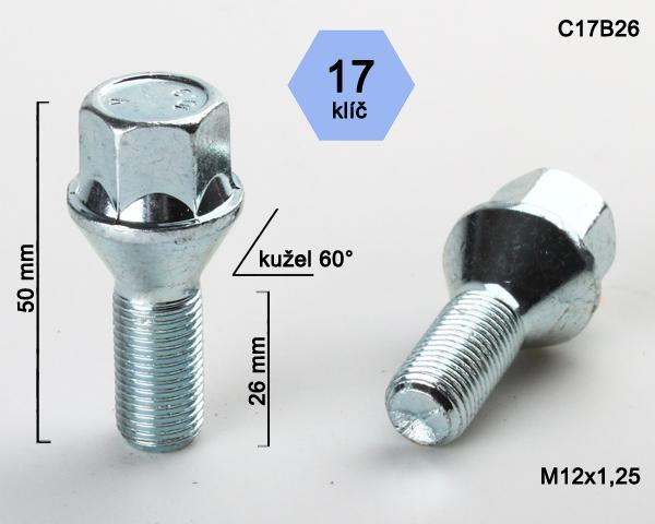 - Šroub na kola M12x1,25x26mm, dosedací plocha kužel, klíč 17, pozink