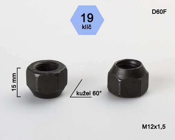 - Kolová matice M12x1,5mm, dosedací plocha kužel, otevřená, klíč 19, černý pozink