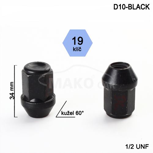 - Kolová matice 1/2 UNF, dosedací plocha kužel, zavřená, klíč 19, barva černá